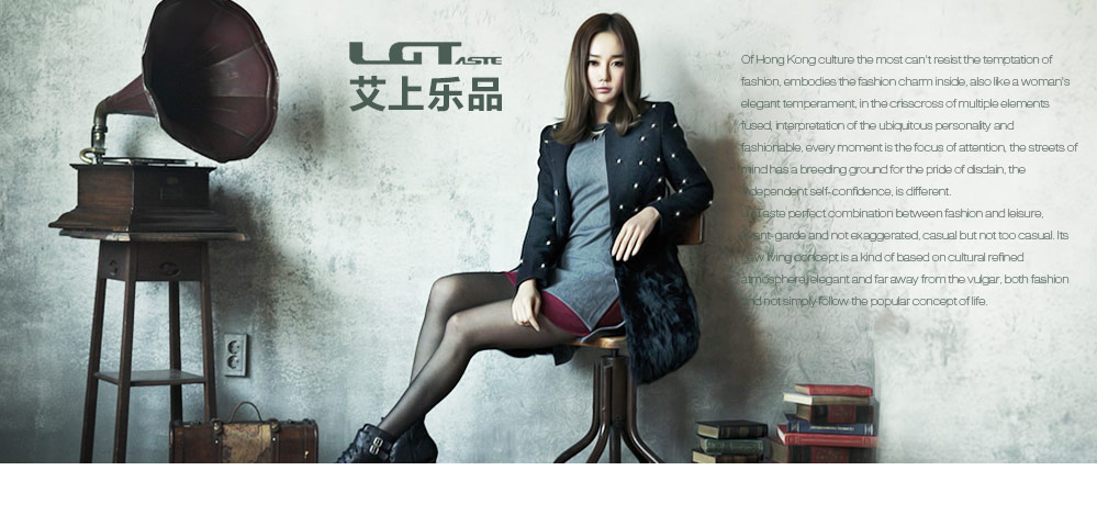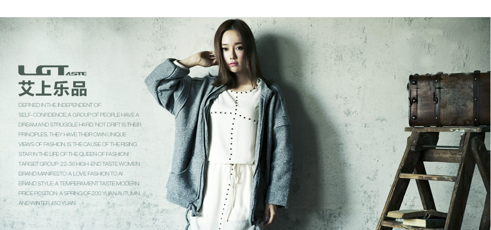 "LGTaste" 使命是快速更新,诠释最新的时尚风向标。艾上乐品"LGTaste"以营造高品位的生活意境,享受轻松愉悦的消费体验,品味时尚的审美乐趣为导向,多种美学概念在设计中巧妙结合,专为22-36岁对时尚和品质敏感,追求时尚、个性、高品质生活的女性设计的中高端品牌女装。融合东西方文化艺术的精髓,传递最新流行趋势,赋予最新、最大胆的理念,以个性时尚的服饰为载体向现代都市女性传递"爱上好品位、爱上好趣味"的品牌内涵!
