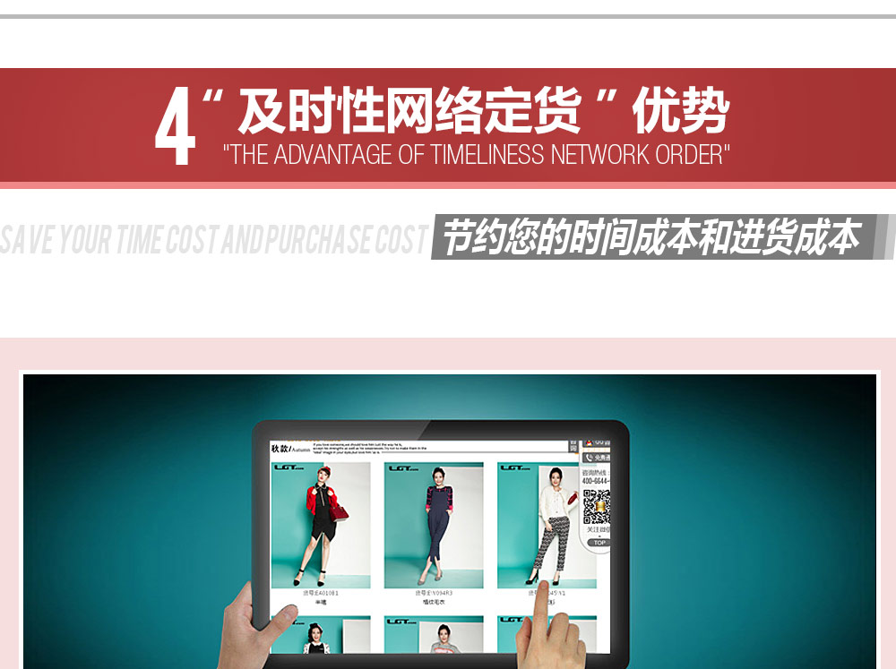区别于其他服装公司,艾上乐品并不建议您同样产品备货太多。推崇 “多批少量”拿货原则,采用网上实时订单选款模式,卖完及补,大大降低您的库存压力,同时也省去现场订货来回奔波劳顿,最大程度节约您的时间成本和进货成本