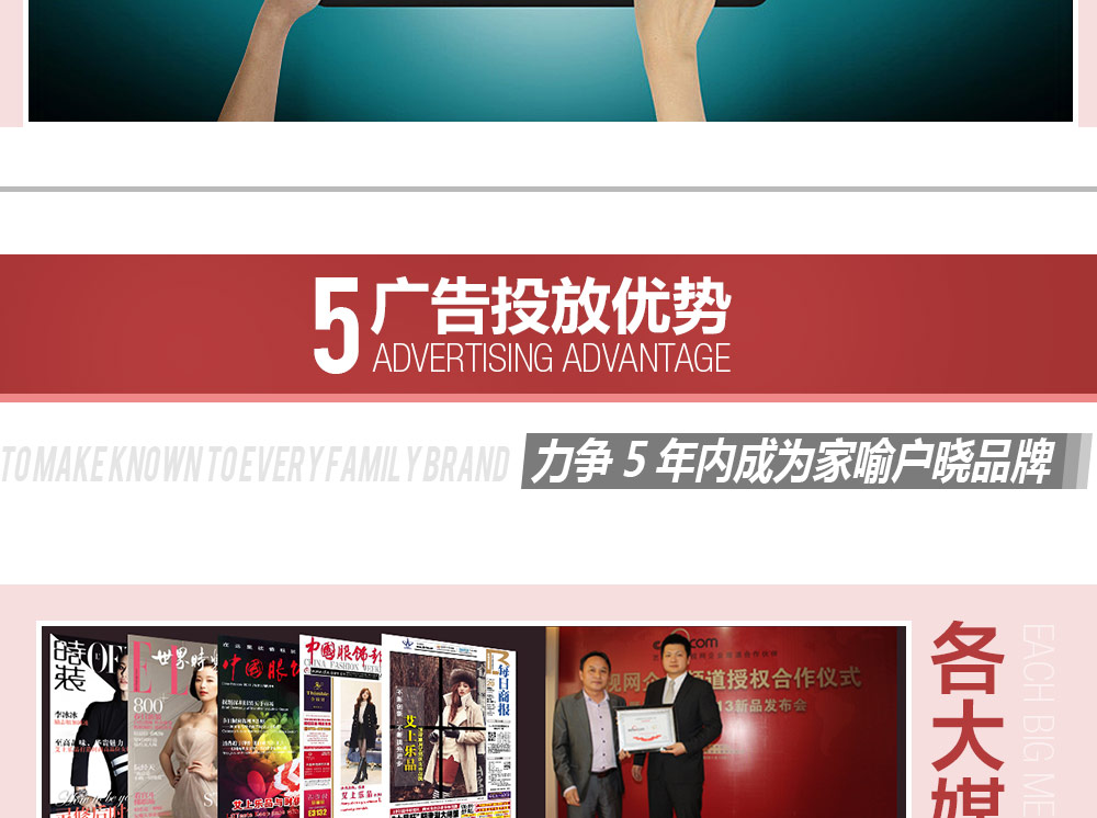 艾上乐品每年对品牌都有详细品牌年度广告投放计划且每年递增。与湖南卫视 深圳卫视 东方卫视 百度 凤凰网。。。。等相关各大媒体都有合作。力争5年之内打造成家喻户晓的国内知名女装品