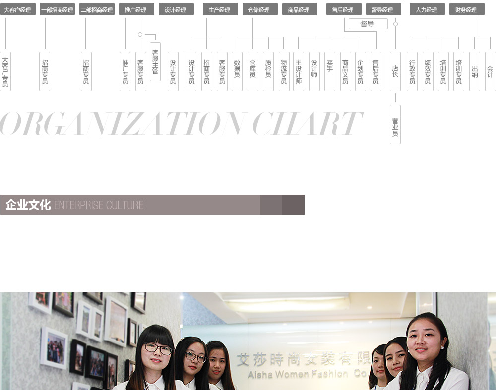 艾莎服饰有限公司是“香港艾上乐品(国际)时尚女装有限公司”在中国大陆地 区的唯一运营商。公司是一家主营高品位时尚女装的全面化服装公司。它集服装设计、生产加工、销售服务、运营管理于一身,致力于打造全方位的国际尖端时 尚服饰。从最初单一的服装加工慢慢发展壮大,开设设计.制造.销售等众多分部,至今公司发展日益完善和成熟,并且在艾莎全体工作人员不懈努力下,公司愈 加强大,在品牌女装界拥有不可替代的一席之地。